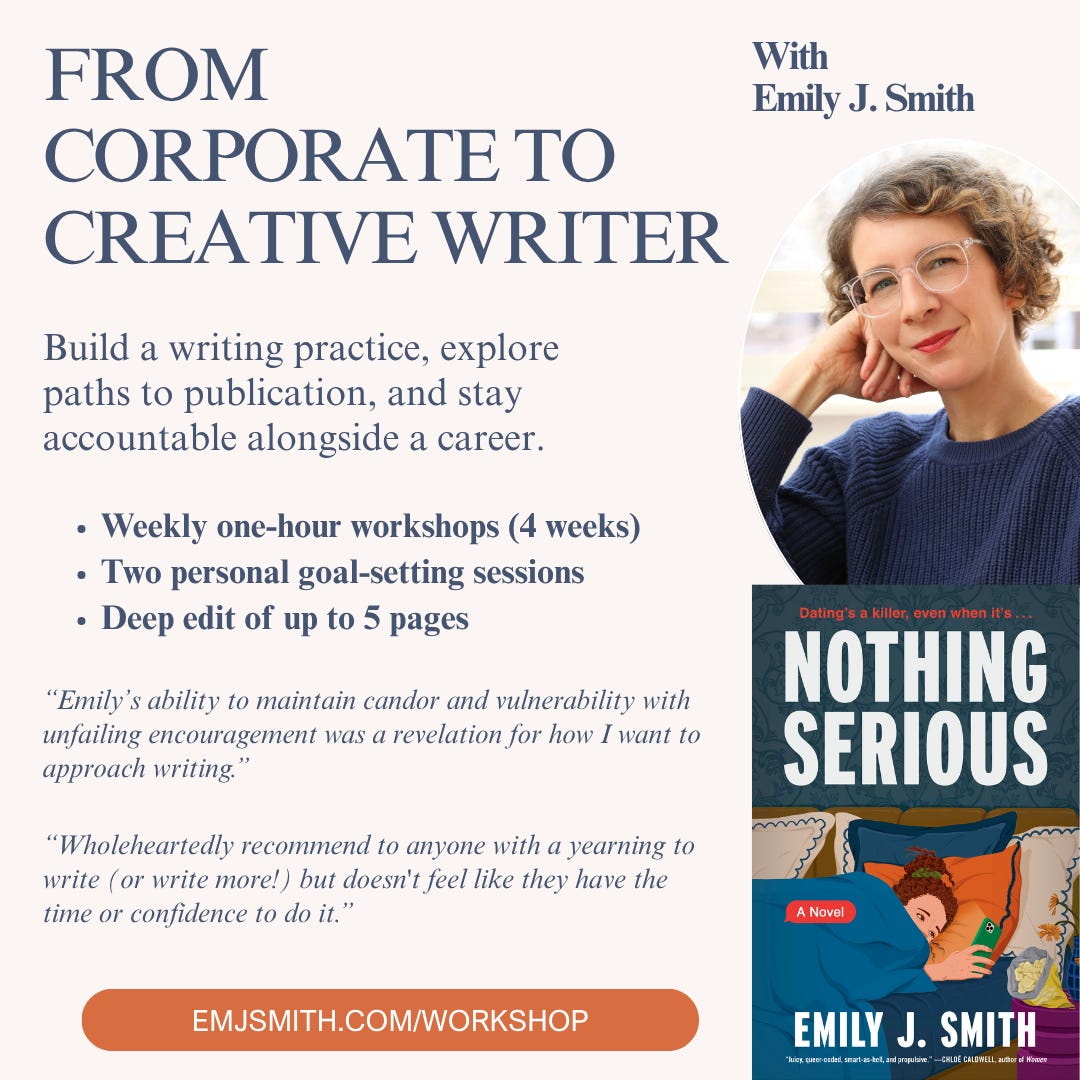 But before I go full steam ahead, I’d love to ask what you specifically want to hear about! It can be related to the writing process—how to get an agent, where ideas for novels come from, how to stay motivated, how to get started, the cost of a book tour, etc. It can be about balancing a corporate and creative life, what it costs career-wise to shift paths, when to take the jump away from your “day job” and how. It can be questions around selfhood and identity, dating and relationships, which are by far my favorite topics to get into. Please send ideas, questions, or half-formed thoughts—anything that comes to mind! You can leave a comment below, DM me on Substack, or reply to this post (it goes to me).